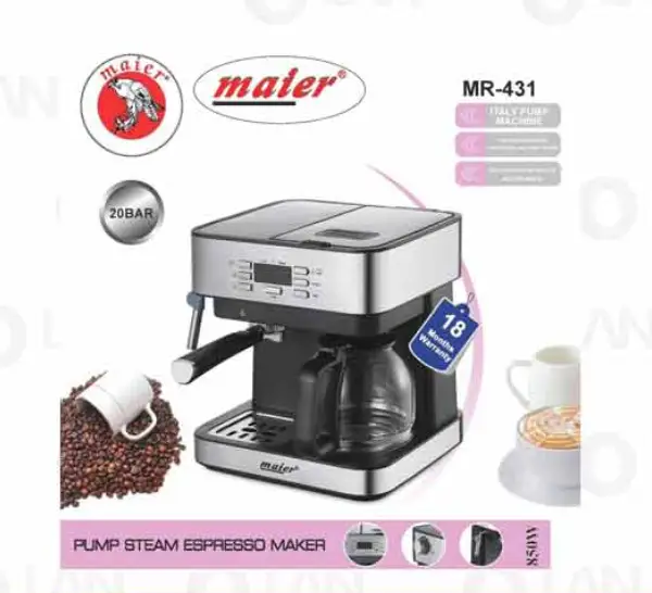 6,700,000 توماناسپر سو ساز مایر MR-431 دستگاه مدل MR-431 توان مصرفی 850وات فشار بخار 20بار گنجایش مخزن 1لیتر دارای نازل بخار دارای نمایشگر بخار دارای سینه چکه گیر جنس بدنه استیل ضد زنگ قابلیت استفاده برای تهیه اسپرسو، لته، کاپوچینو و … قوری مخصوص قهوه ارائه دهنده بانه پیک