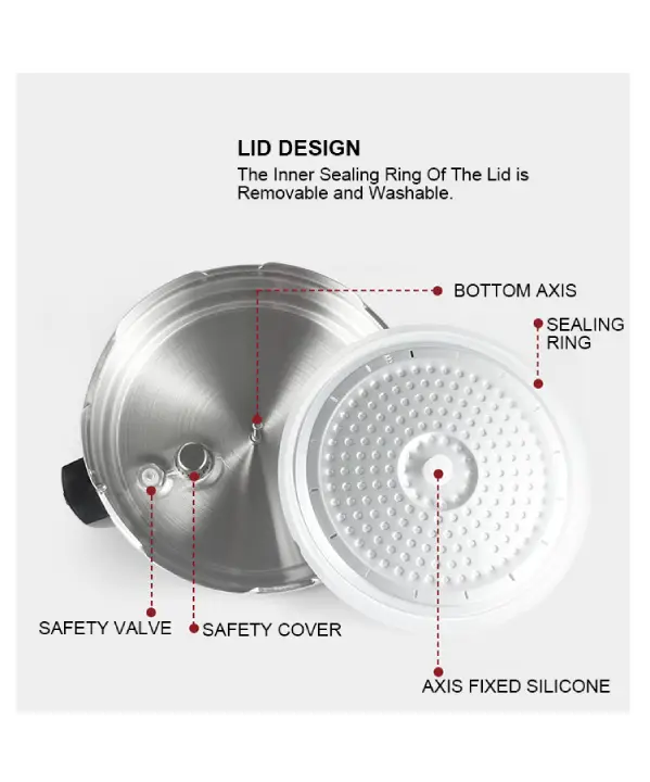زود پز تفال از استیل ضد زنگ نوع SUS304 ساخته شده است. و دارای خاصیت ایمنی و سلامتی و زیبایی و همچنین دارای تولرنس و تحمل گرما heat tolerance و شستشوی آسان است.